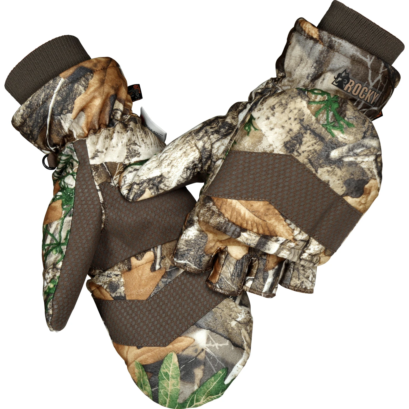 The Rocky® Fleece Glomitt keeps hands warm on the hunt, yet it’s designed for function. The exterior suede fabric provides complete silence in the woods. While the interior fleece lining keeps your hands and fingers warm. Both features work together to wick away moisture, so you can be certain that you’ll never have sweaty palms. Bulky gloves and mittens can get in the way. That’s why Rocky made this glomitt with a tuck-away mitten cover with camouflage. The design enables you to keep your fingers and thumb open or shield them from the cold to give increased dexterity. You’ll want this glomitt over traditional hunting gear, any day.