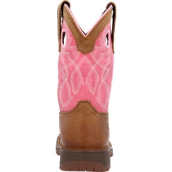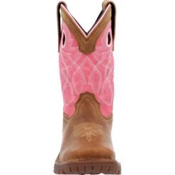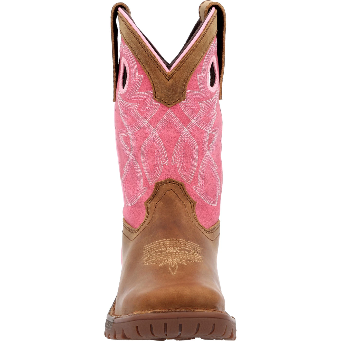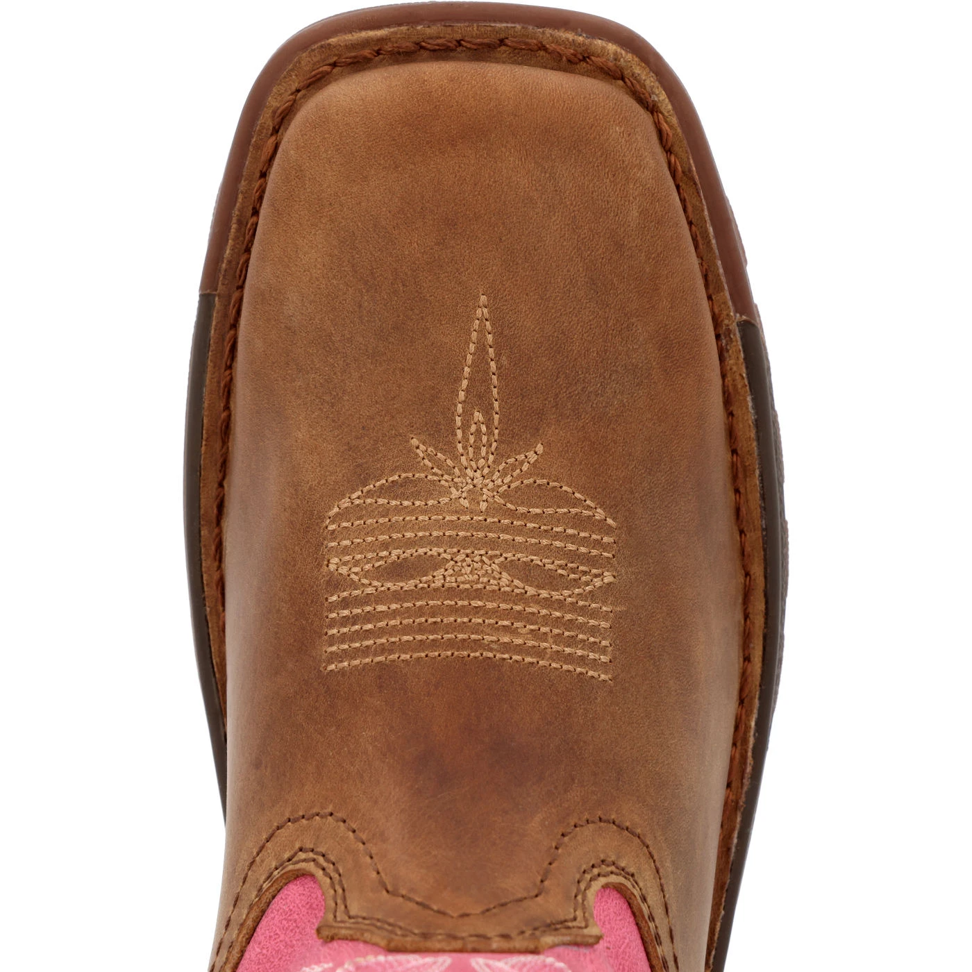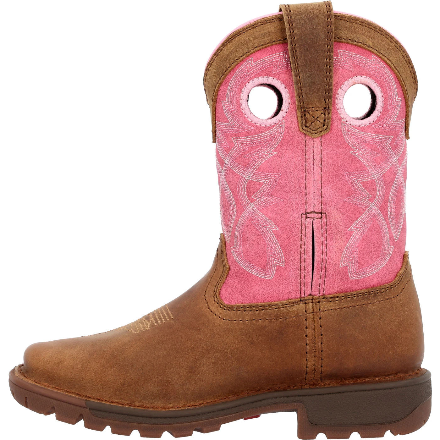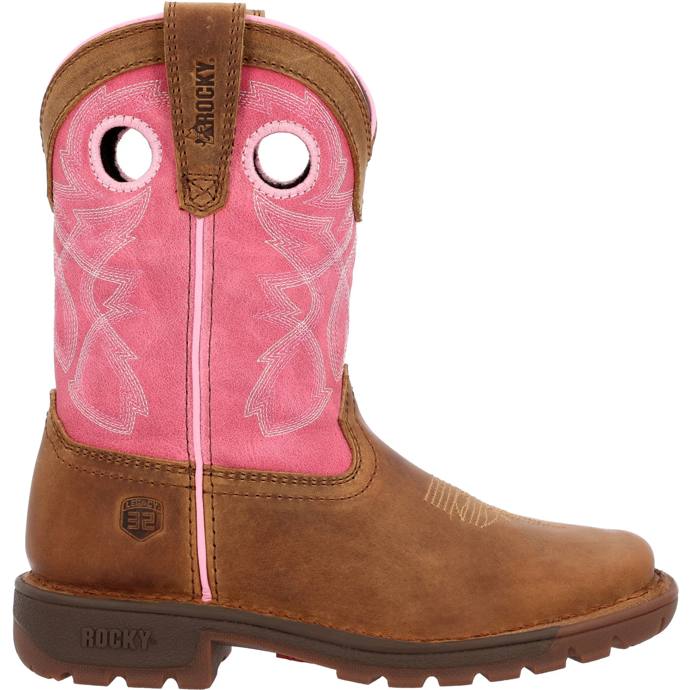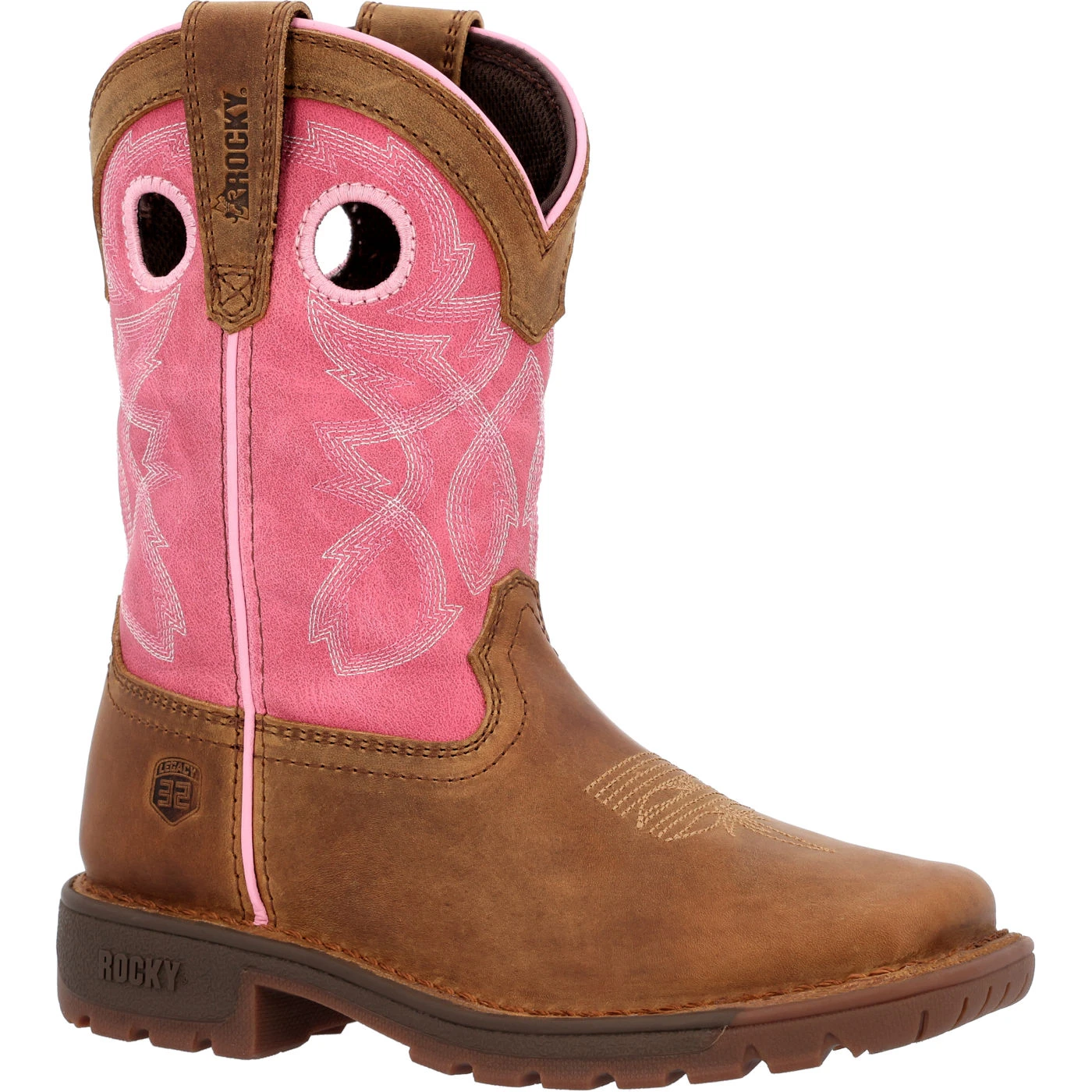The Rocky Kid’s Legacy 32 Pull-On Western Boot delivers great western style at a great value. This brown & pink 8-inch boot is made with a full-grain leather foot and a man-made shaft. Built to keep up with your little one’s adventures, this square toe boot features a stitch out construction, fiberglass shank, and an oil- and slip-resisting rubber outsole. The expansion fit seam and convenient pull holes makes it an easy on and off, while its cushioned footbed keeps little feet comfortable all day long.
