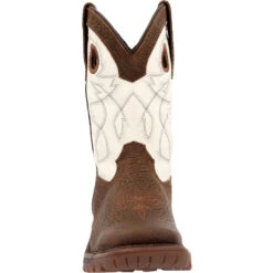 The Rocky Kid’s Legacy 32 Pull-On Western Boot delivers great western style at a great value. This brown & bone 8-inch boot is made with a full-grain leather foot and a man-made shaft. Built to keep up with your little one’s adventures, this square toe boot features a stitch out construction, fiberglass shank, and an oil- and slip-resisting rubber outsole. The expansion fit seam and convenient pull holes makes it an easy on and off, while its cushioned footbed keeps little feet comfortable all day long.