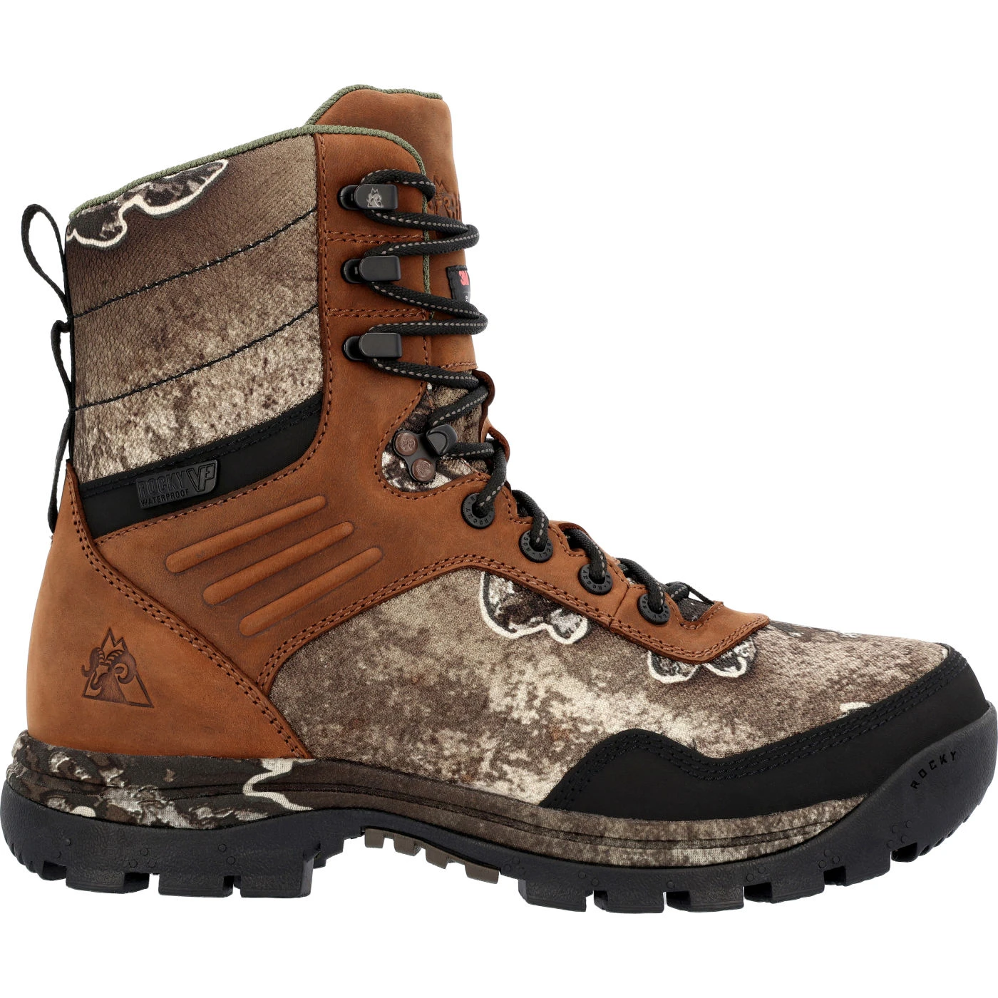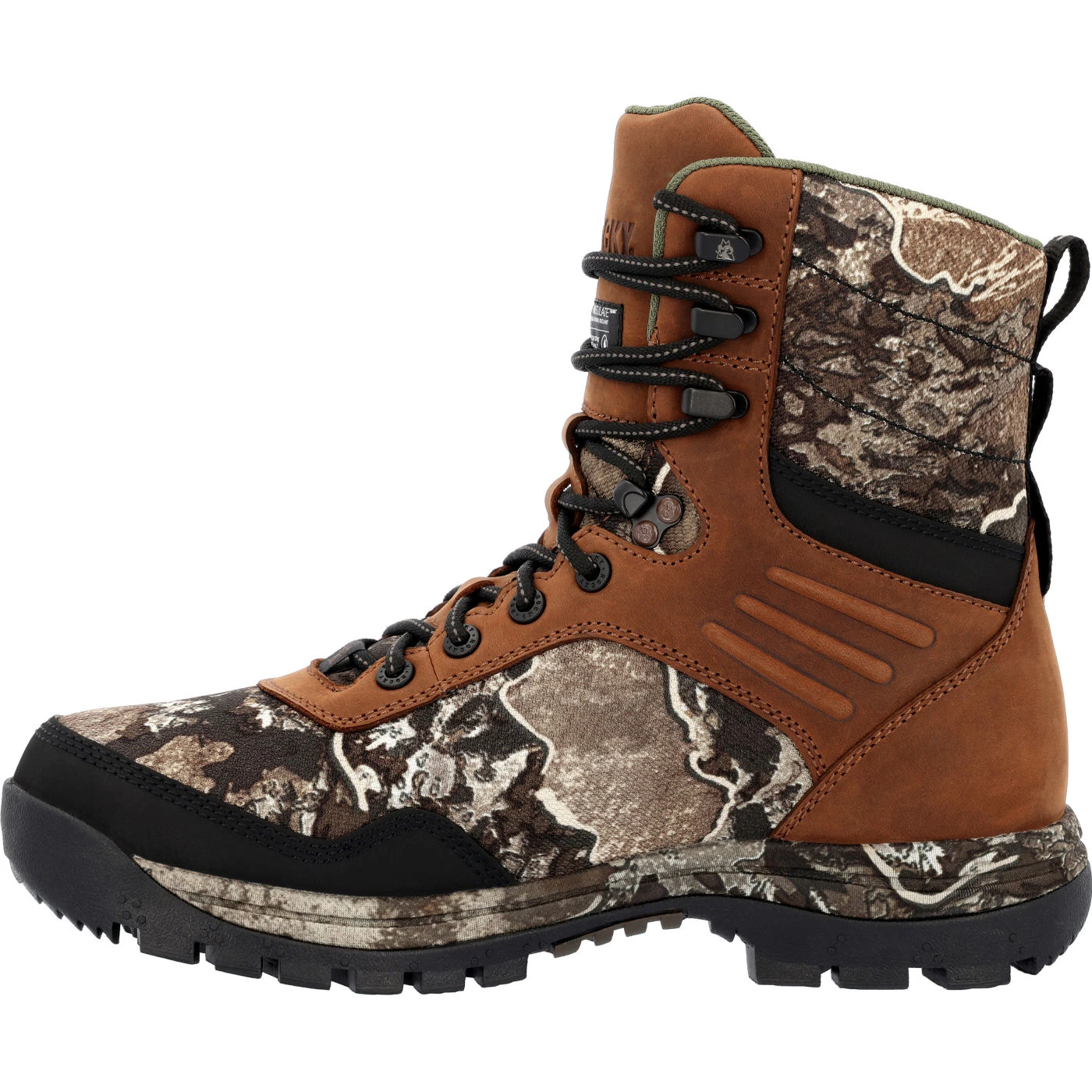 This 8 inch boot features the Realtree Excape™ Camo with a light and flexible cement construction. Your feet will stay warm and dry all day long with the waterproof Full Grain Leather with Cordura®, 1 Year Vapor Pass Breathable Recycled Membrane Waterproofing and the 400 Grams of 3M™ Thinsulate™ Ultra Insulation. Built with Rocky Rebound Footbed and Aggressive All-Terrain Lynx Outsole the Rocky Lynx Waterproof 400G Insulated Boot will keep your feet comfortable all day long.