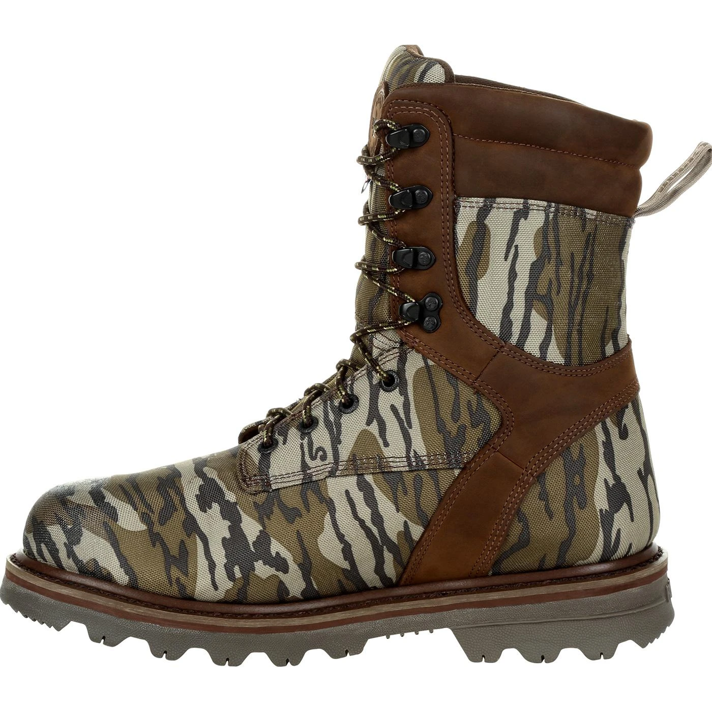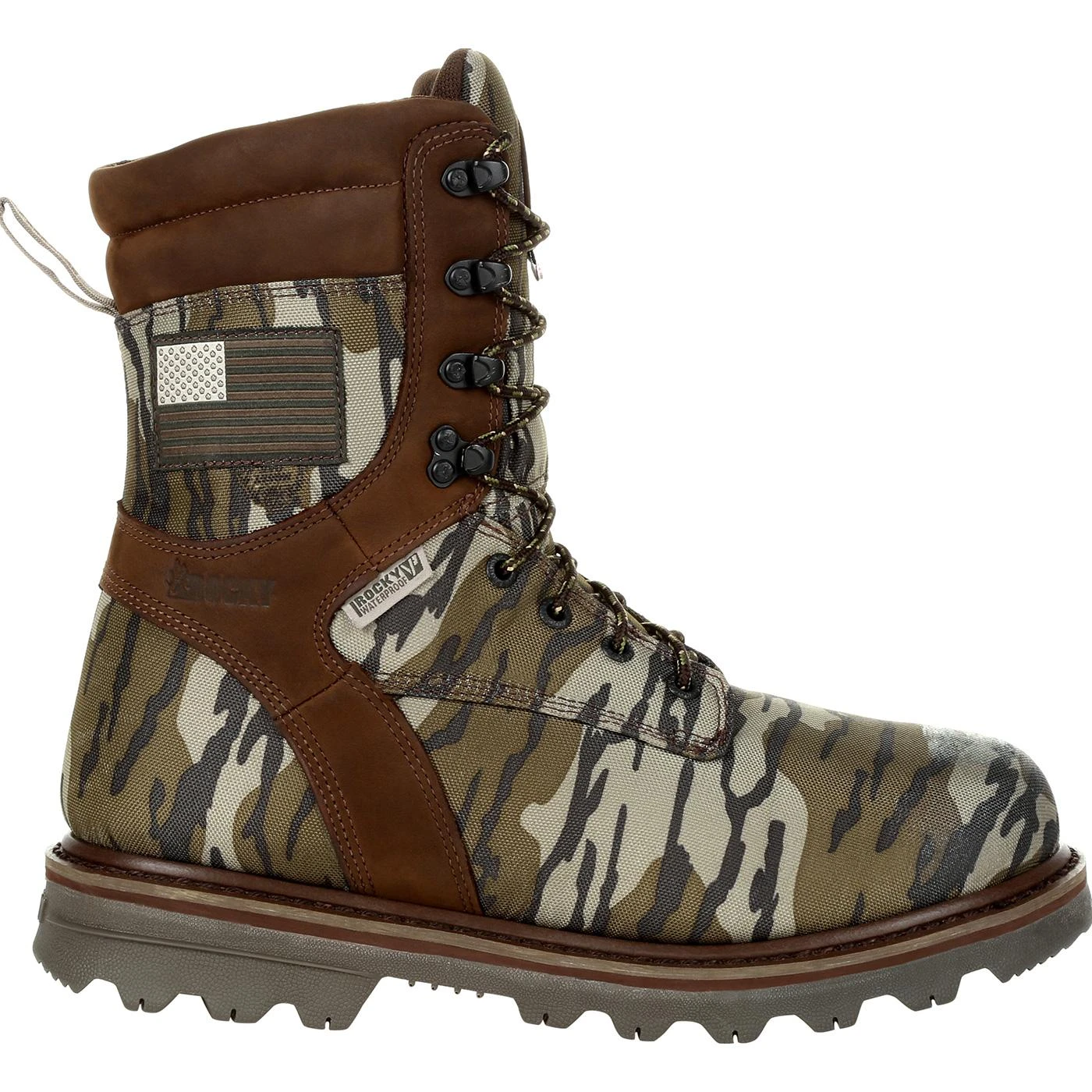 Made in USA with USA and globally sourced components. The Rocky Stalker is built to take on the great outdoors. This 9-inch Mossy Oak Bottomlands insulated waterproof boot will help you make the most of any hunt. Tackle any terrain with 900 denier Cordura, leather accents, a light and flexible cement construction, and a durable heavy duty self-cleaning polyurethane outsole. Experience unrivaled comfort with Rocky’s Air-Port footbed and a fiberglass shank that adds additional stability and support. Cold, wet environments are no match for these boots with 400 grams of 3M™ Thinsulate™ ultra insulation and Rocky’s VP Waterproof technology that keeps moisture out without trapping perspiration in. Take your hunt to the next level with all day comfort in the Rocky Stalker.