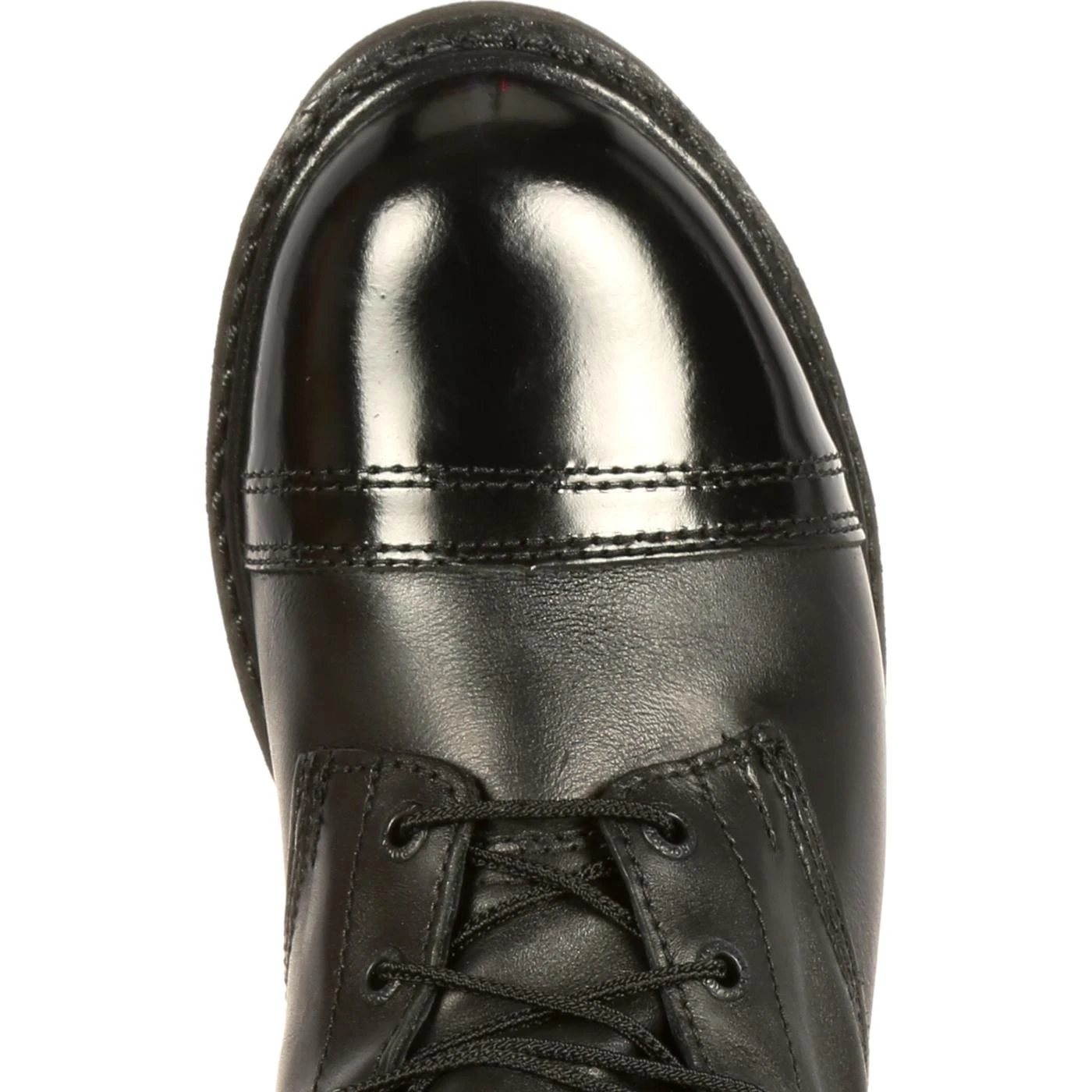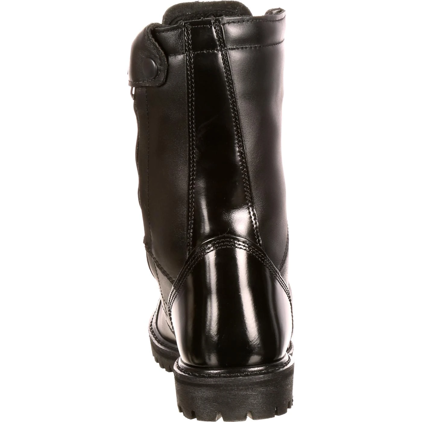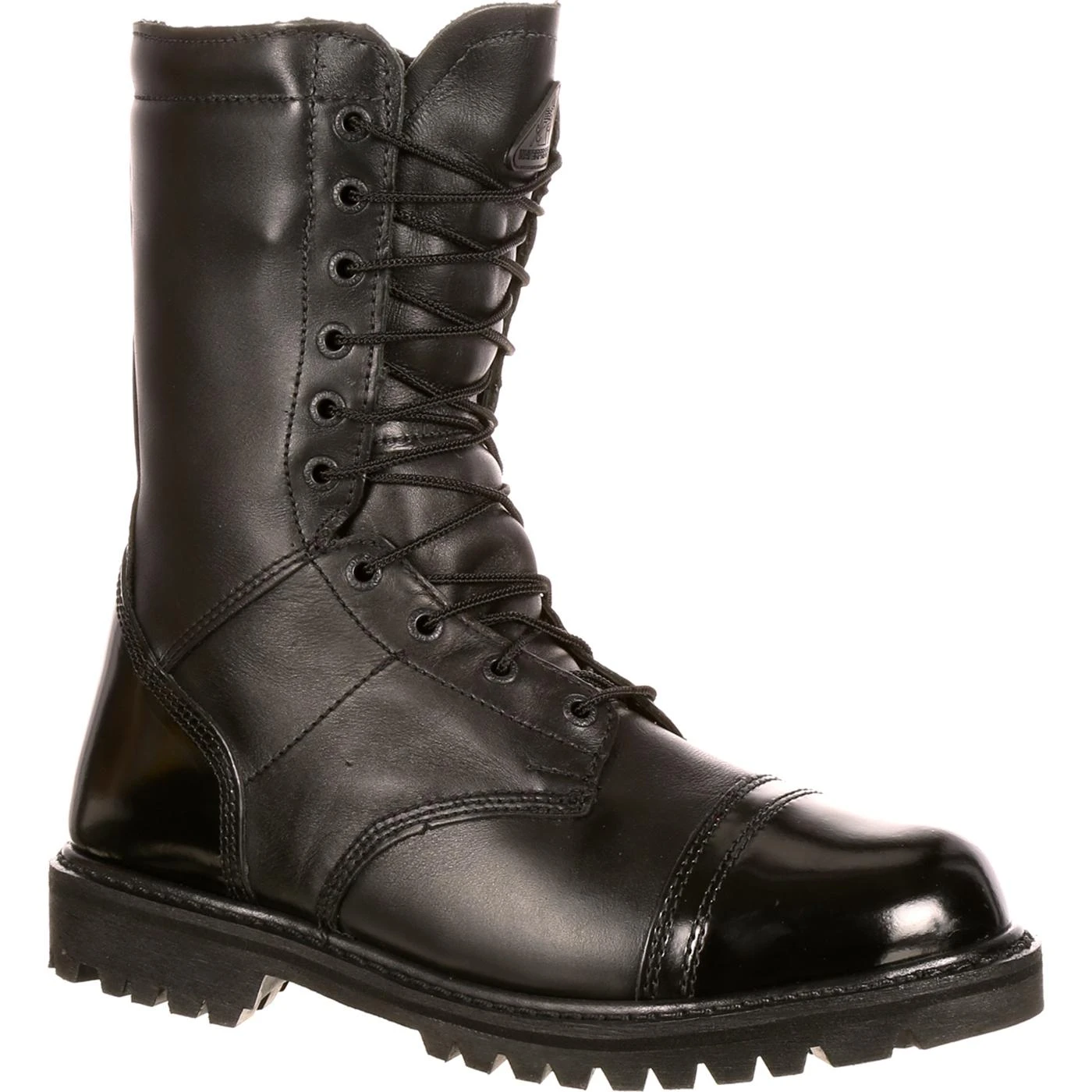 The upper of these 10-inch Rocky Paratrooper boots is constructed from genuine full-grain leather. A smooth leather toe cap and heel have been added, which is great for those occasions when you want to give these black public service boots a nice spit-shine.